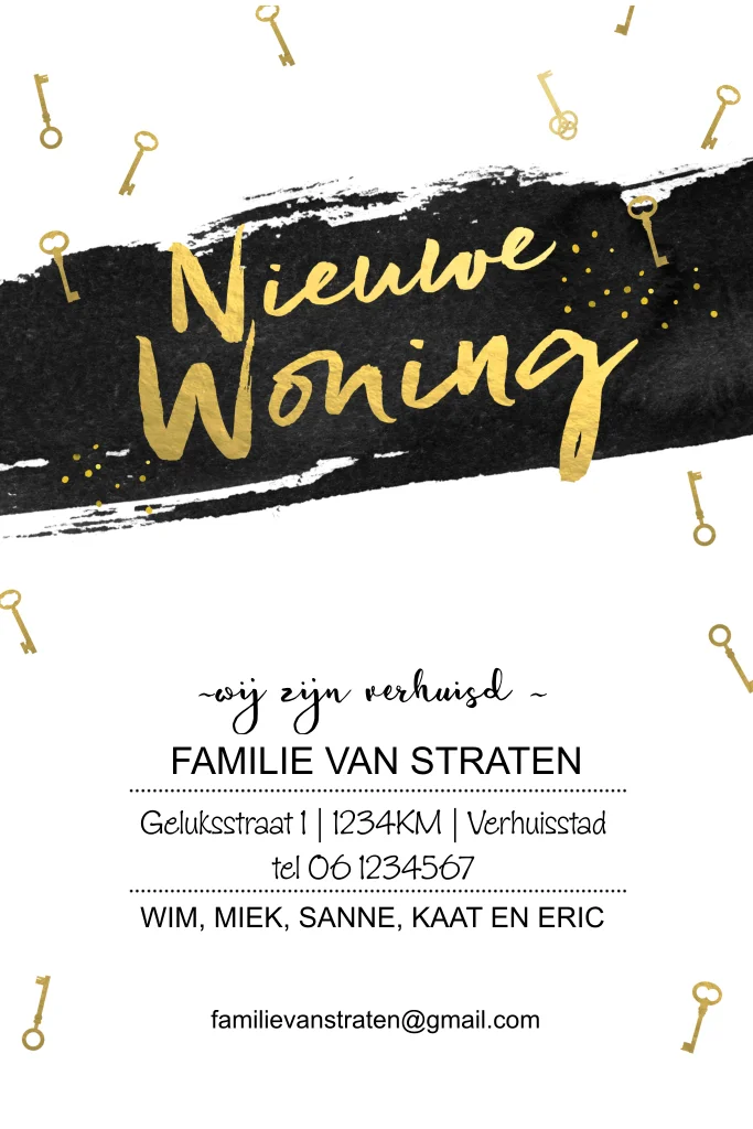 Verhuiskaart met nieuwe woning en sleutels in goudlook