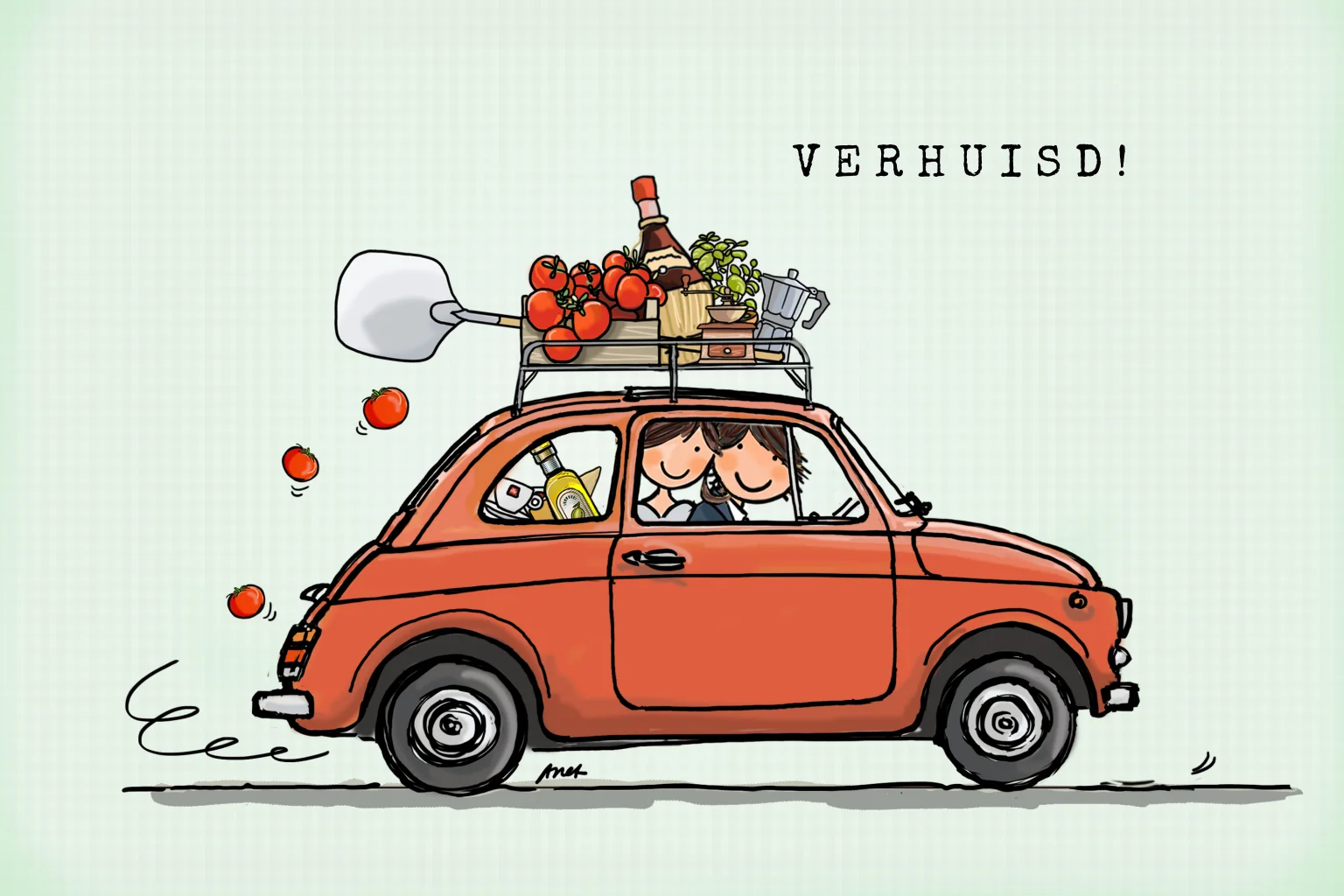 Unieke verhuiskaart met illustratie oldtimer aan het verhuizen