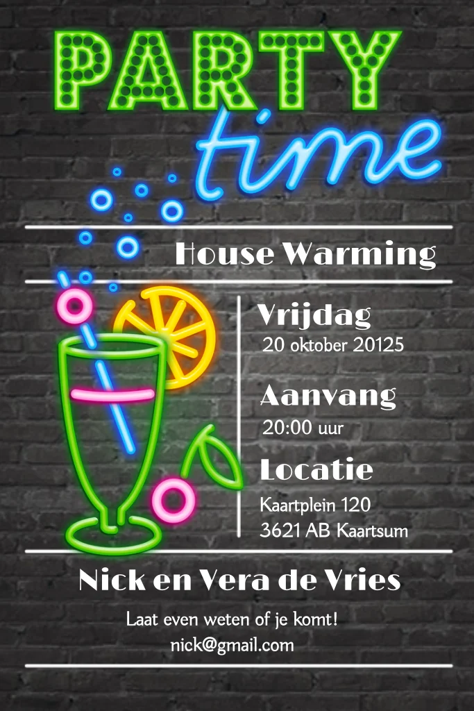 Feestelijke verhuiskaart met cocktail in neon en party lichten. Schrijf de datum van de housewarming op de kaart.