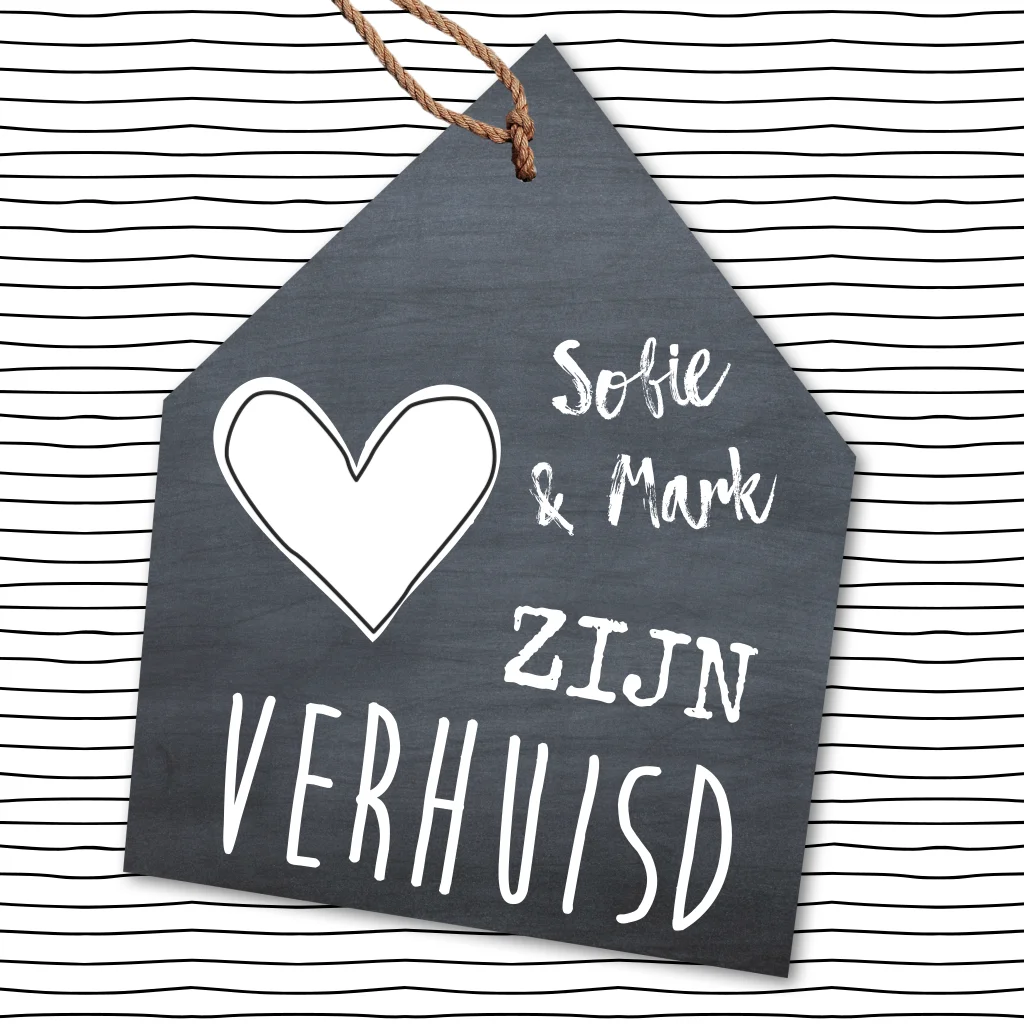 Een huisje van krijtbord aan een touwtje, wat origineel voor een verhuiskaart! Het hartje en de streepjesachtergrond passen helemaal bij dit hippe zwart-wit kaartje.