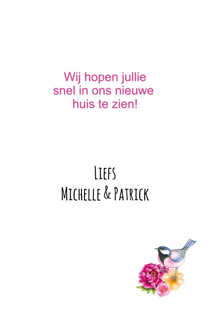 Nieuwe woning? Gefeliciteerd! Stuur dit vrolijke kaartje op met jullie nieuwe adres! Hij is versierd met een illustratie van een vogelhuisje, bloemen en vlinders. Teksten pas je eenvoudig zelf aan.